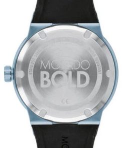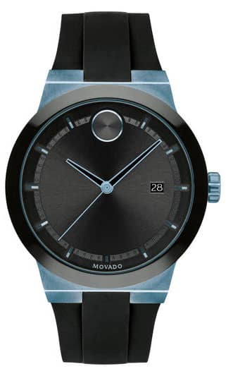 Movado BOLD Fusion 42.3mm Watch w/ Black w/ Ice Blue Accents Dial & Silicone Strap, Model 3600626Movado BOLD Fusion, 42 mm ice blue ion-plated stainless steel case & black ceramic bezel with a black-toned dial on black silicone strap. Beyond The Dot: