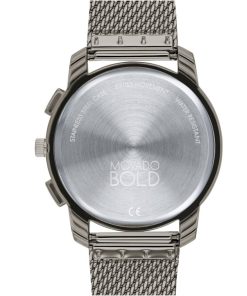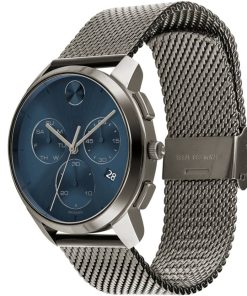 Movado BOLD Thin 42mm Chronograph Watch w/ Blue Dial Gunmetal Ion-Plated Stainless Steel Mesh Bracelet, Model 3600721Movado BOLD, 42mm gunmetal ion-plated stainless steel case and mesh bracelet with blue chronograph dial. Beyond The Dot: