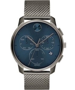 Movado BOLD Thin 42mm Chronograph Watch w/ Blue Dial Gunmetal Ion-Plated Stainless Steel Mesh Bracelet, Model 3600721Movado BOLD, 42mm gunmetal ion-plated stainless steel case and mesh bracelet with blue chronograph dial. Beyond The Dot: