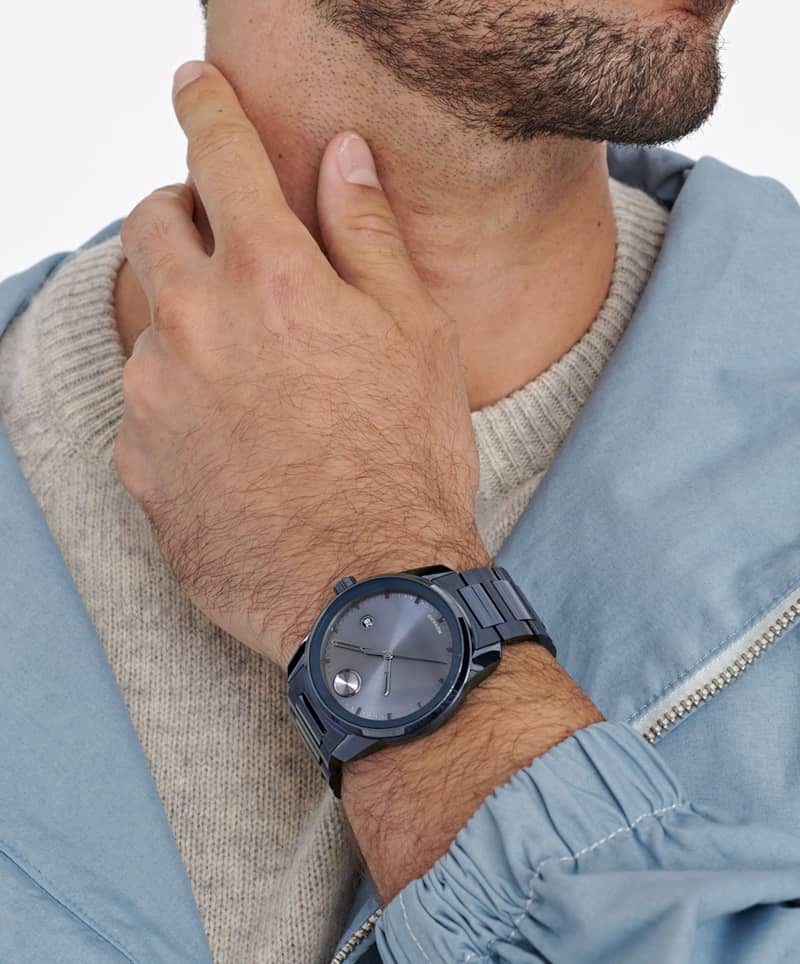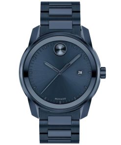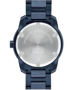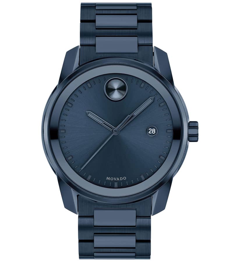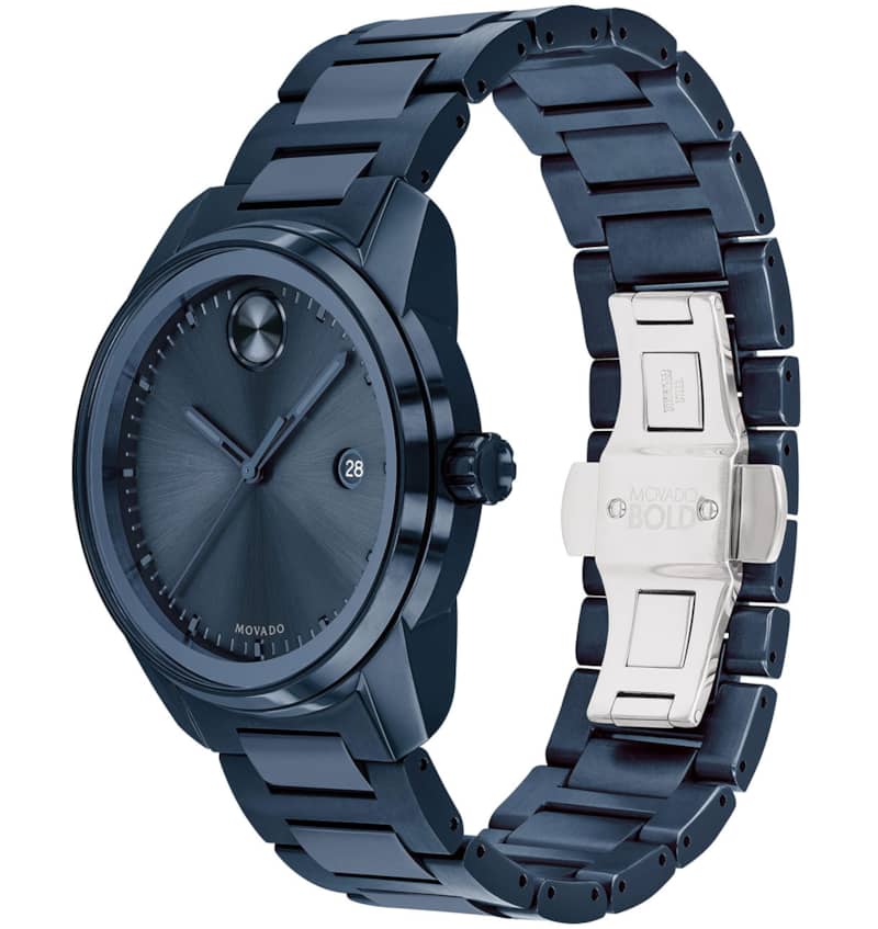 Movado BOLD Verso 42mm Watch w/ Blue Dial & Ion-Plated Stainless Steel Link Bracelet, Model 3600737Movado BOLD Verso, 42mm blue ion-plated stainless steel case and bracelet. Features a blue dial with Swiss Super-LumiNova? accents and date window detailing. Beyond The Dot: