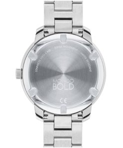 Movado BOLD Verso 38mm Watch w/ Silver Metallic Dial & Stainless Steel Link Bracelet, Model 3600747Movado BOLD Verso, 38 mm stainless steel case and bracelet with silver-toned dial. Features pale rose gold accents, date window detailing, and minute track. Beyond The Dot: