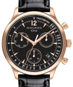 Movado Heritage Series Circa 43mm Chronograph Watch w/ Black Dial & Crocodile Strap, Model 3650109Movado Heritage Series Circa, 43 mm rose gold ion-plated stainless steel case with black chronograph dial on black faux crocodile leather strap. Beyond The Dot: