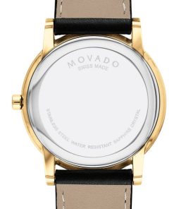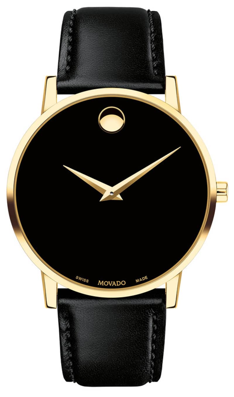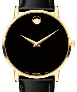 Movado Museum Classic 40mm Watch w/ Black Dial & Leather Strap, Model 0607271Men’s Museum Classic watch, 40 mm yellow gold PVD-finished stainless steel case, black Museum dial with yellow gold-toned dot and hands, black calfskin strap with stainless steel buckle. Beyond The Dot: