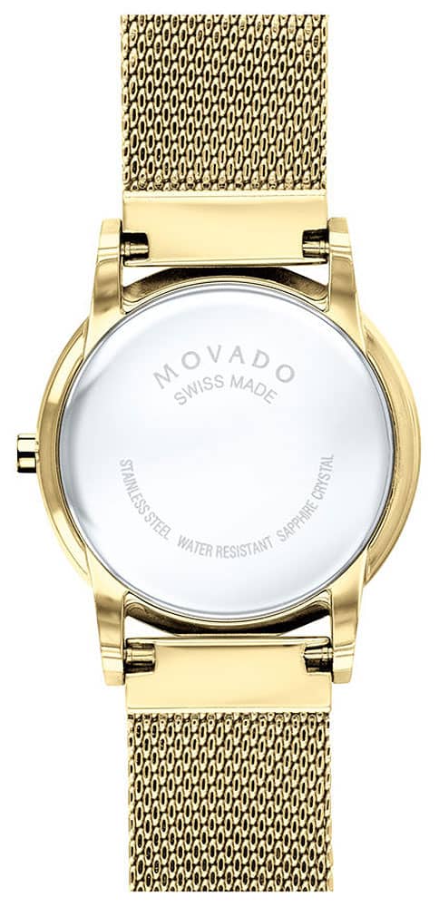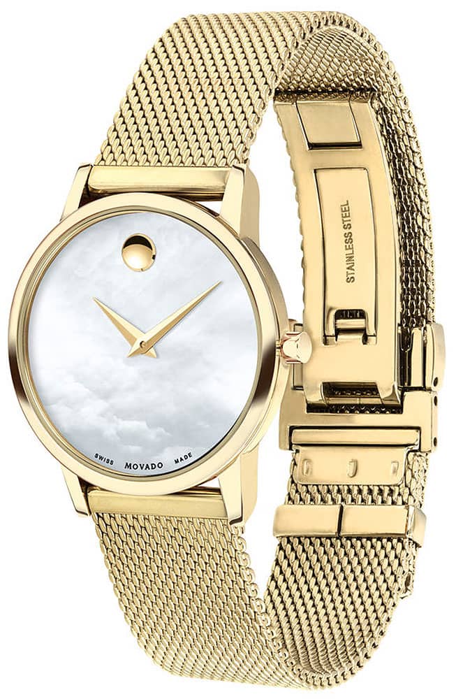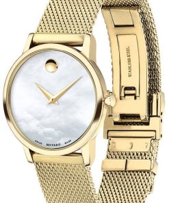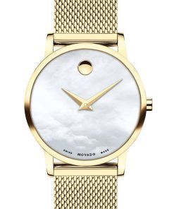 Movado Museum Classic White MOP Dial Yellow Gold-Tone PVD Mesh Bracelet Watch, 28mm