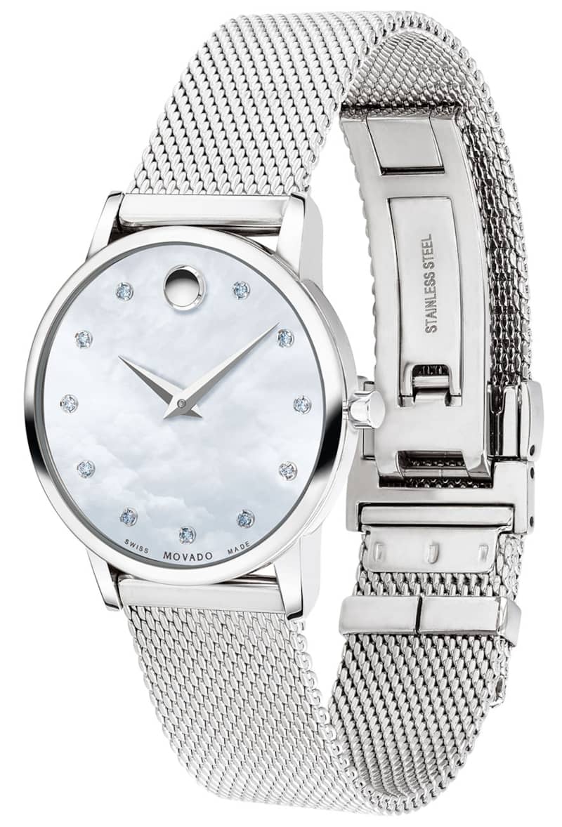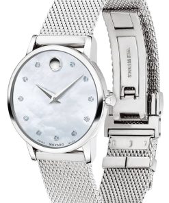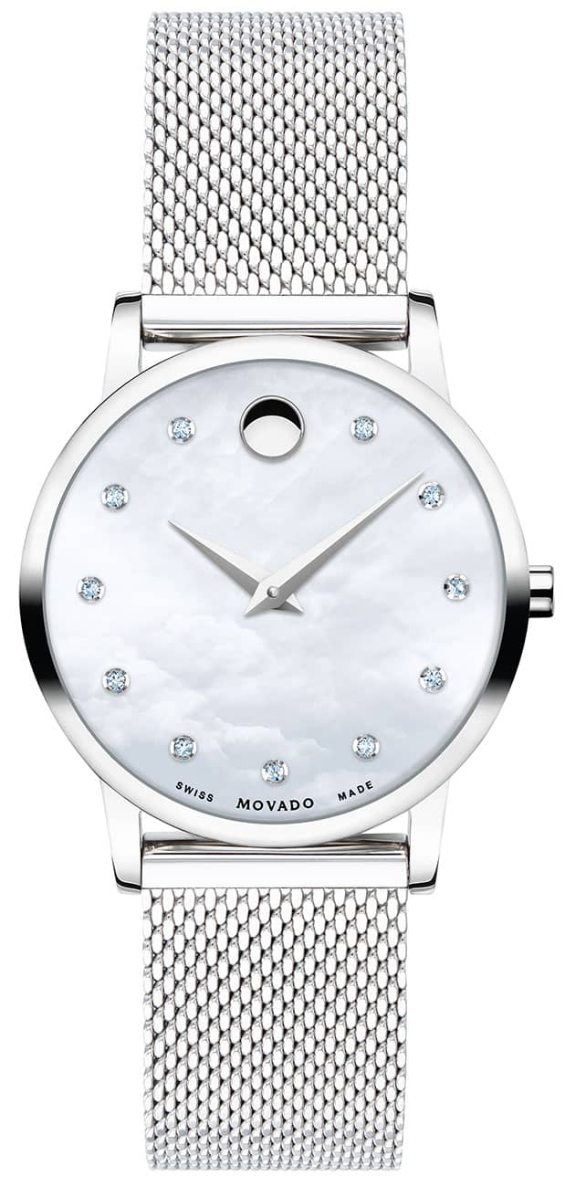 Movado Museum Classic 28mm Watch w/ White Mother-Of-Pearl w/ Diamonds Dial Silver Mesh Bracelet, Model 0607491Movado Museum Classic, 28 mm stainless steel case and mesh bracelet with white mother-of-pearl dial & 11 Diamond Markers. Beyond The Dot: