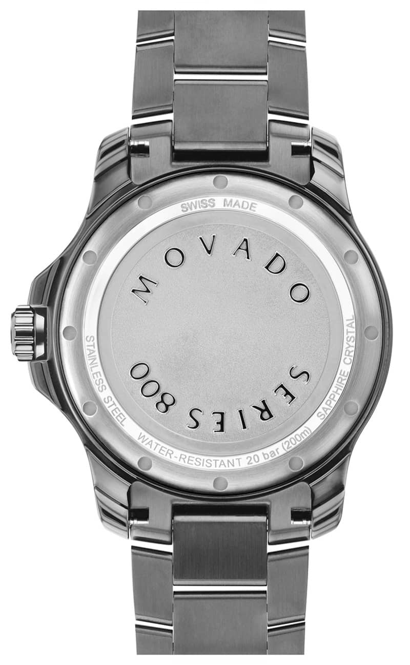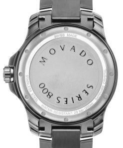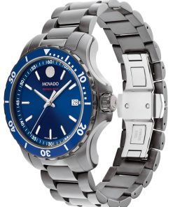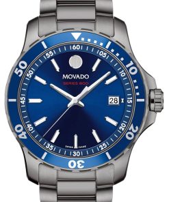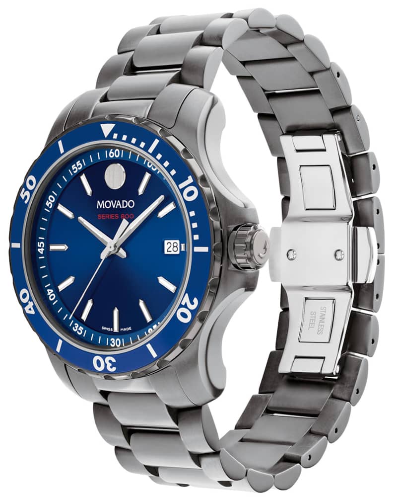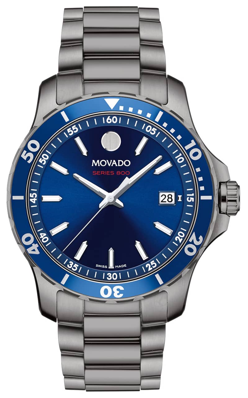 Movado Series 800 40mm Watch w/ Blue Dial Mid-Grey PVD-Finished Stainless Steel Bracelet, Model 2600159Movado Series 800, 40mm mid-grey PVD-finished stainless steel case and bracelet with blue dial, unidirectional bezel and date window detailing. Beyond The Dot: