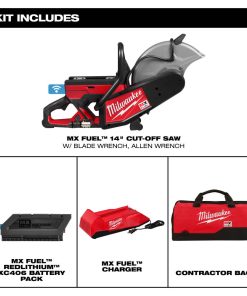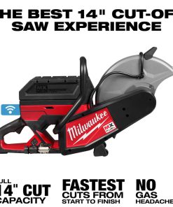 The MILWAUKEE? MX FUEL? 14?? Cut-Off Saw delivers the best 14?? cut-off saw experience with full 14?? cut capacity, fastest cuts from start to finish, and no gas headaches. A full 14?? capacity delivers the ability to cut up to 5?? depths in a large variety of materials. It also gives the freedom to choose between 12?? and 14?? blades. The POWERSTATE? Brushless Motor gives the power to cut through a wide range of tough materials from concrete to rebar and ductile iron. The MX FUEL? REDLITHIUM? battery pack provides instant power with no gas headaches. This results in the demo saw having fewer wearable parts, less noise and vibration, and zero emissions for a safer workspace indoors or outdoors. The cordless cut off saw is compatible with all MX FUEL? REDLITHIUM? batteries, delivering the hardest working and most reliable power for equipment. The push-button activation eliminates the repetitive motions of a pull start and gives the ability to cut materials faster from start to finish. This reduces downtime and gets the job done faster. REDLINK PLUS? Intelligence ensures optimal tool performance and provides overload protection to protect the machine and battery during the toughest applications. The MX FUEL? 14?? Cut-Off Saw is ONE-KEY? Compatible. Track, manage and secure equipment from mobile devices or computers using the industry??s largest Bluetooth? community tracking network. If the cut-off saw is ever lost or stolen, prevent tampering with remote lockout capability.