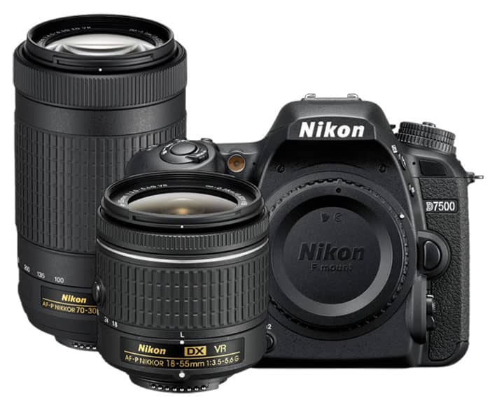 Nikon 13560 D7500 Black Digital SLR Camera 18-55mm & 70-300mm Lens KitThe D7500 Dual Zoom Lens Kit consists of the D7500 DSLR along with two NIKKOR lenses, the compact and versatile AF-P DX NIKKOR 18-55mm f/3.5-5.6G VR and the far-reaching AF-P DX NIKKOR 70-300mm f/4.5-6.3G ED VR lens. Both lenses feature Nikon??s Vibration Reduction image stabilization for sharp images. Capture sports, wildlife, concerts, landmarks and more with precision. Both lenses use a pulse motor (utilizing stepping motors) for ultra-fast, near silent autofocus. Key Features