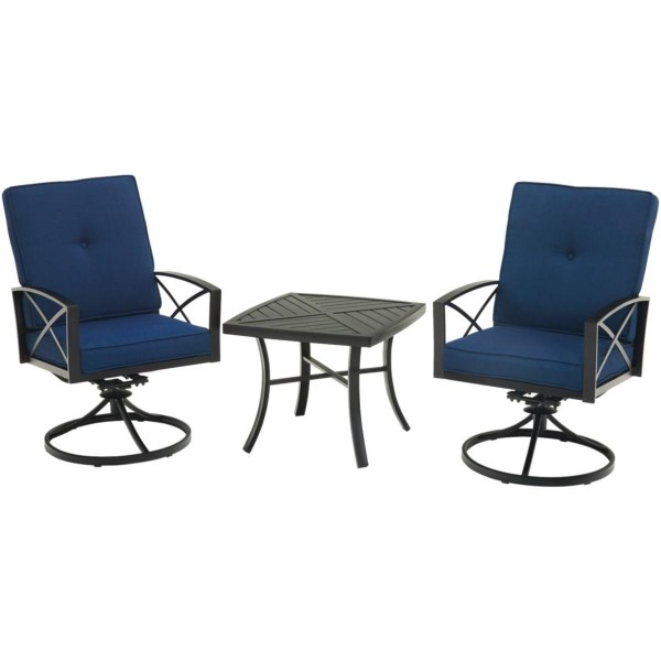 3-piece swivel bistro set. Set includes two cushioned swivel chairs and a durable steel slate table. This set is perfect for any space. Table dimensions: 24 In. W. x 24 In. D. x 20 In H. Chair Dimensions: 23 In. W. x 30 In. D. x 35 In. H.