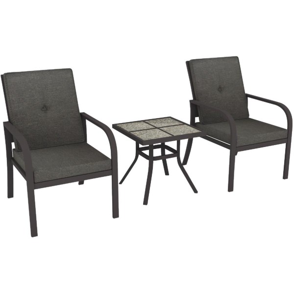 3-piece cushioned bistro set, designed with your relaxation in mind. Enjoy the touch of luxury in the faux marble tiled tabletop, and the foundation of the steel framed furniture with its powder coated finish. Polyester cushions complete the set awaiting your moment to unwind and enjoy the warm weather. Lightweight yet sturdy construction. Powder coated steel framed chairs are accented with polyest fabric custhions and compleated with the faux marble tiles tabletop side table. 220-pound maximum seating weight.