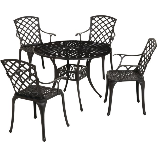 5-piece cast aluminum patio dining set. Features a black powder-coat finish for long life. Seating for 4 people. Weight capacity per seat 242 pounds.