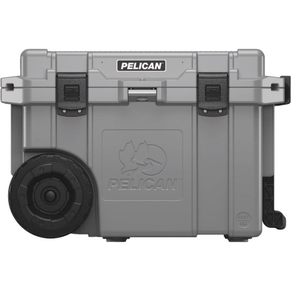 Pelican 45-quart wheeled Elite cooler is ideal for any outdoor adventure. A folding trolley handle conveniently stores out of the way while not in use, while heavy-duty oversized wheels make moving across a variety of terrains easy. Molded-in locking hasp doubles as a bottle opener, while the 2 polyurethane insulation and freezer grade gasket allow for up to 10 days ice retention. Easily and securely close your cooler with press & pull latches that hold tight under pressure but can be opened even while wearing gloves. The lid features an integrated fish scale, and the bottom of the cooler has non-skid and non-marking raised feet. Easily empty your cooler with the sloped drain & tethered threaded plug that can be attached to any standard garden hose. Backed by a legendary lifetime guarantee of excellence.