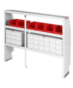Includes 44in high adjustable cargo van shelving and a mesh van bulkhead