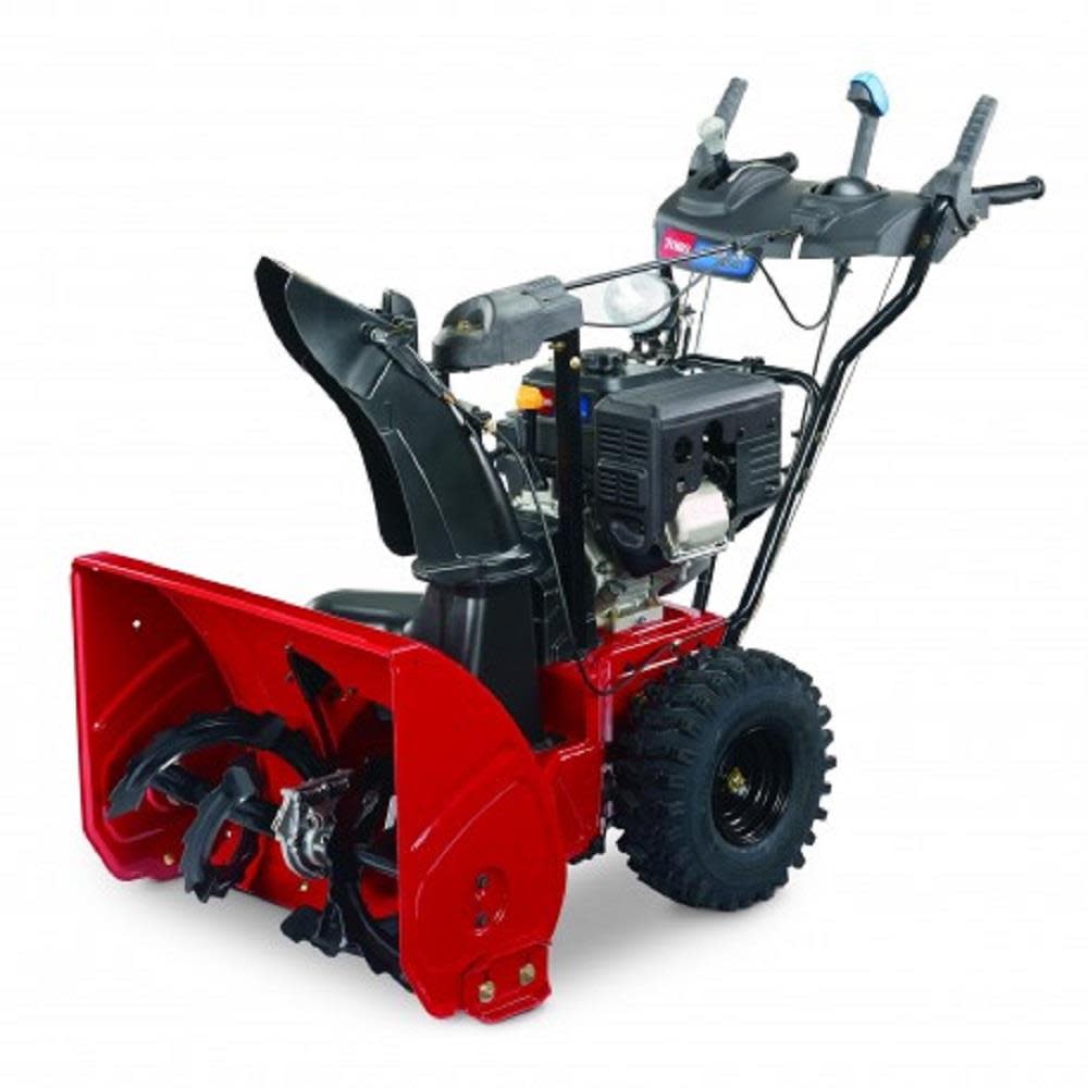 The Power Max 824 OE with Toro premium 252cc OHV 4-cycle engine provides proven power and performance to make your job easier in tough winter conditions. Throws snow up to 45 Ft. (13.5 m) feet away with a 24 In. (61 cm) clearing width and 20 In. (51 cm) intake height. Ideal for concrete, asphalt or gravel surfaces that can park up to 4 – 10 cars and 6 to 12 In. (15 to 31 cm) of snow at a time. Everything from the housing, frame, ACS, and chute are 100% steel construction, meaning this snow blower is built to last. All new double deflector provides wider range of throw, from right next to a fence or far as the operator needs. The convenient one-hand operation lever frees the other hand to change speeds or adjust the chute without stopping. Easily change the chute direction and angle with the quick stick?? chute control. A breakthrough in snow blowing technology, the exclusive anti-clogging system meters snow intake to prevent clogging and maximize clearing efficiency. The heavy-duty auger gearbox has special oversized hardened gears and shafts designed to withstand extreme stress. No shear pins needed! If the auger hits hard material, the engine will stall to prevent damage.