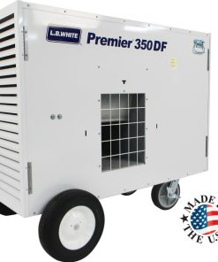 The Premier? 350 DF portable heater offers the ultimate combination of efficiency and convenience. With an enclosed flame design this direct-fired portable heater combines 99% fuel efficiency with the convenience of heat that can be ducted up to 36 feet. Generates less than 72 dB of sound so you can comfortably have a conversation while operating. Operate your dual fuel heater from propane gas or natural gas. A lockable fuel selector value allows for safe switching between fuel sources ?C no conversion kit required. It produces 350,000 BTU per hour with 2,500 CFM of heated air output. Easily start from a reliable electronic ignition and manage temperature with remote thermostat. Manufactured in Wisconsin from durable components to provide years of dependable performance. Remote thermostat, regulator, and 15 ft hose included. Air distribution accessories sold separately. Buy this certified portable heater with confidence ?C L.B. White backs your purchase with a 2-year warranty and free lifetime of technical support.