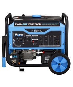 Pulsar??s PG12000B dual fuel portable generator was built to keep you out of the dark during the next power outage. The dual fuel feature with the ability to run on gasoline or liquid propane to provide you with more options and peace of mind in the event of a natural disaster. It??s 457 cc, single cylinder, 4-stroke, OHV engine produces 12000W peak/9500W running on gasoline and 10800W peak/8550W running on LPG. The extended run-time and output make it an ideal source of backup power for running large appliances and other electronic devices, so you can comfortably weather the storm. The PG12000B??s convenient Switch & Go technology allows you to seamlessly transition between fuel sources while in use without you missing a beat. It??s durable steel frame, 10 In. never-flat wheels, and convenient drop-down handles make storage and maneuvering easier than ever. When you need the convenience of portability and the power to perform, the Pulsar PG12000B has you covered. (4) 120V Outlets, (1) 120/240V twist-lock outlet, (1) 120/240V 50A RV outlet, & (1) 12V DC output. Switch & Go capability with electric push start and recoil back-up. Includes propane hose, spark plug wrench, SLA battery and mobility kit. EPA Approved.