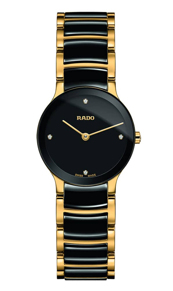 Rado Centrix Diamonds Quartz Black Dial Two-Tone Watch, 23mm – R30189712Rado Centrix – Embodying elegance in clarity. The shape and style of the Rado Centrix make this a watch to desire. The tapered, lightweight, flexible bracelet gently and sensually embraces the wrist, offering exquisite comfort and grace. Classic. Features
