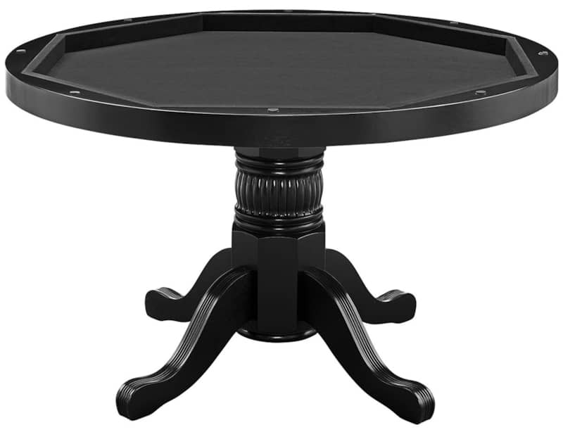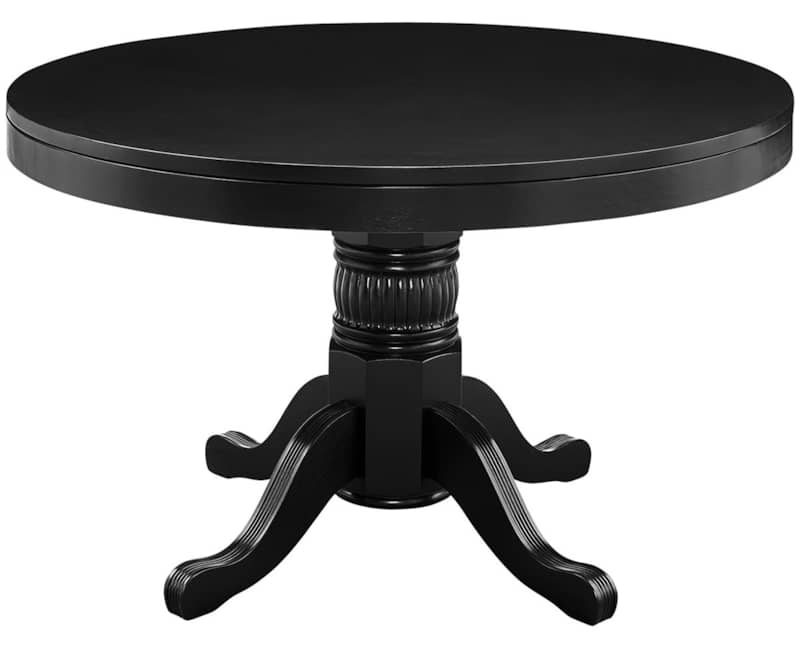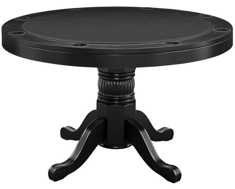 RAM Game Room GTBL48 BLK 48″ 2 In 1 Game Table In BlackPerfect for everything from Blackjack to Texas Hold ??Em, this round gaming table boasts beautiful solid wood construction in a black finish, with a padded vinyl playing surface. Features
