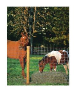 Rigid yet flexible construction for easy installation on rolling meadows or hilly terrain. Non-climb, closely woven 2 ft x 4 ft mesh vertical pattern prevents hoofed animals from “stepping through” or “walking down” fence. 12-1/2 ga filler wire, 10 ga top and bottom wire.