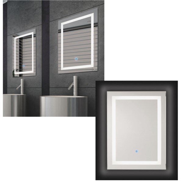 Backlit wall mirror featuring long lasting 120-light 5050 LED (light emitting diode) strip. Includes Sensor Touch controls, energy efficient lighting, and a slim design. Provides smooth and even light distribution. With the light source at eye level, it highlights all areas of the face and provides ideal task lighting. Includes mounting hardware and hardwire installation. Can be mounted vertically or horizontally. LED strip rated for 50,000 hours. Uses 35 watts, produces 2640 lumens and 6000 Kelvin color temperature. UL (Underwriter’s Laboratories) listed. 5-year warranty.