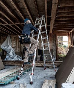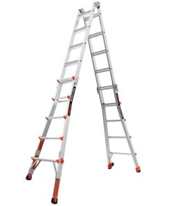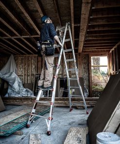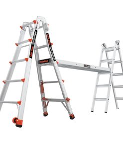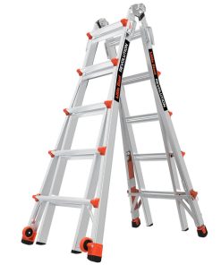 An intense job calls for an intense tool. The Little Giant? Revolution? ladder helps you complete those heavy-duty tasks. From roofing, to tinning, to general maintenance, the Revolution is the ladder to help you get stuff done. The Revolution was designed with you in mind. The Quad-Lock? hinge and metal Rock Locks? allow for quick and easy height and position adjustment. The Tip & Glide? wheels help you move the ladder easily from job to job. Uneven terrain? Not a problem. With the ratchet leg levelers, you can adjust the ladder??s legs in seconds, allowing you to stabilize the ladder on unlevel ground. The retractable legs give you more than eight inches of leveling adjustment. The Revolution is designed to help you work quickly and effectively, since it can be used in multiple positions. Use the Revolution in the stepladder, extension, staircase, 90-degree or trestle-and-plank scaffolding positions, depending on the needs of the job. The Revolution is rated to hold 300 lbs. it meets or exceeds all OSHA and ANSI standards in all configurations. In the stepladder position, the Revolution can hold 300 lbs. on both sides.