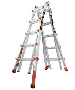 An intense job calls for an intense tool. The Little Giant? Revolution? ladder helps you complete those heavy-duty tasks. From roofing, to tinning, to general maintenance, the Revolution is the ladder to help you get stuff done. The Revolution was designed with you in mind. The Quad-Lock? hinge and metal Rock Locks? allow for quick and easy height and position adjustment. The Tip & Glide? wheels help you move the ladder easily from job to job. Uneven terrain? Not a problem. With the ratchet leg levelers, you can adjust the ladder??s legs in seconds, allowing you to stabilize the ladder on unlevel ground. The retractable legs give you more than eight inches of leveling adjustment. The Revolution is designed to help you work quickly and effectively, since it can be used in multiple positions. Use the Revolution in the stepladder, extension, staircase, 90-degree or trestle-and-plank scaffolding positions, depending on the needs of the job. The Revolution is rated to hold 300 lbs. it meets or exceeds all OSHA and ANSI standards in all configurations. In the stepladder position, the Revolution can hold 300 lbs. on both sides.