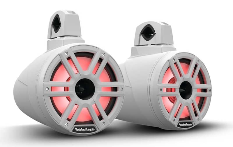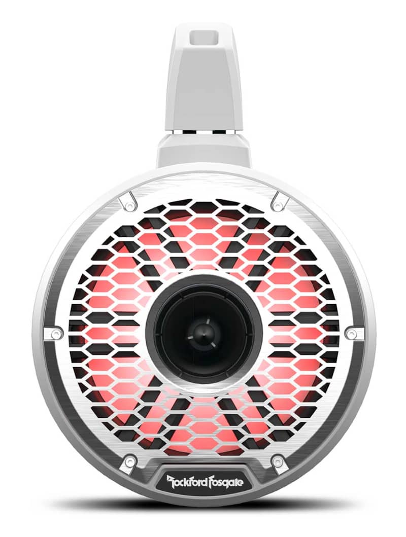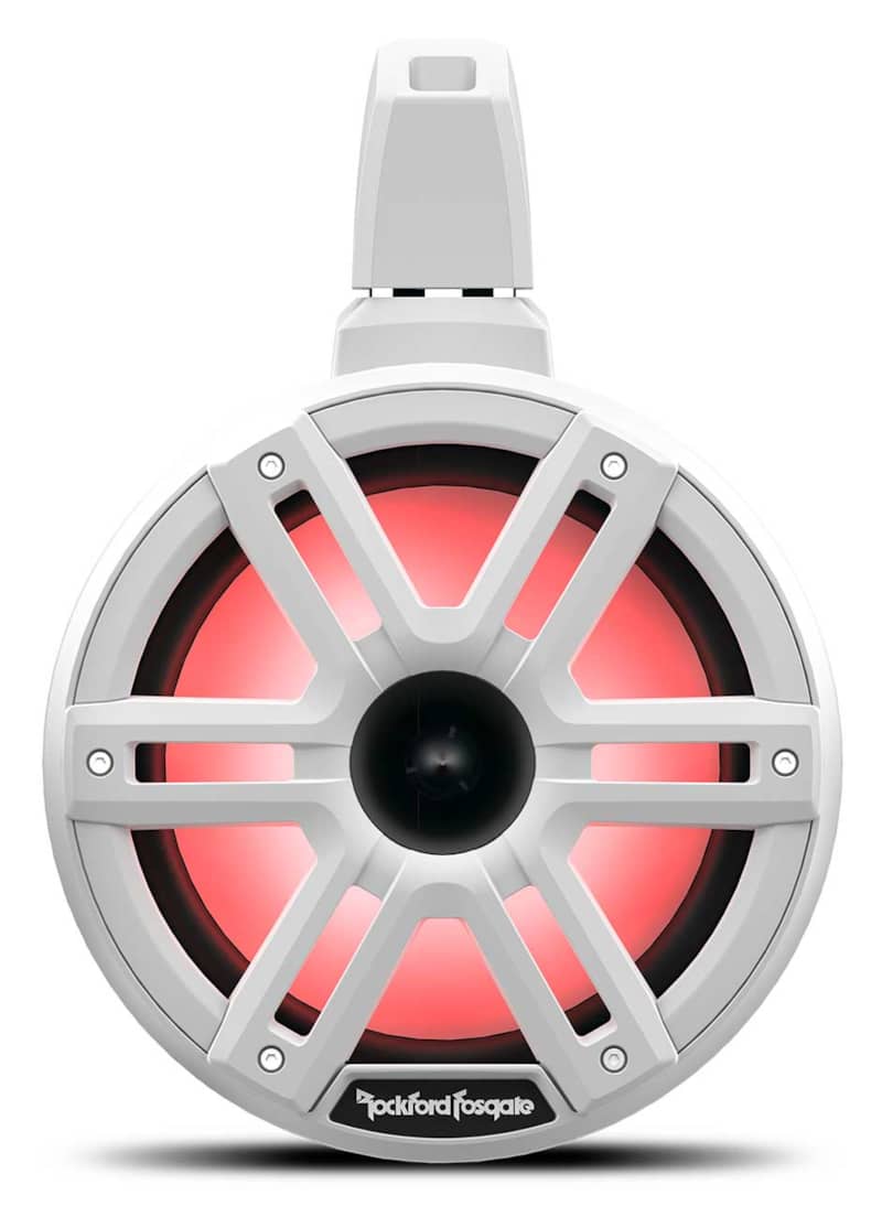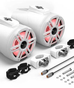 Rockford Fosgate M2WL-8H M2 8″ Color Optix White Marine 2-Way Horn Wake Tower Speakers (Pair)The M2WL-8H Color Optix? 8″ 2-way speakers deliver loud, clear, accurate sound, and light the way for your fresh or salt-water journey! Exceptional clarity and distance is possible with the built-in loaded horn, designed to project music to the skier or wakeboarder. The M2 can be installed using direct mount or a clamp mount method that provides 360-degree rotation on wake tower bar sizes from 1.5?? to 3??. The M2 includes stainless-steel and white ??sport?? grille inserts and features a rear illuminated 3DIL? medallion that can be rotated 360-degrees for proper orientation. The speakers connect with the Rockford Fosgate Color Optix? Controller (sold separately) and RF Connect App, allowing you to customize both front speaker and rear medallion with your own color patterns. The M2 series of Element Ready? wake tower speakers are designed to pair with the Rockford Fosgate Color Optix? Controller and RF Connect App through one of its two Deutsch?/Amphenol? connectors integrated into the speaker. The first one is located inside the center of the 360-degree clamp for a stealth look, and the second is located on the upper-rear for installations where the enclosure is mounted directly to the wake tower bar. These water-tight connections are IP67 certified, making these speakers Element Ready? and truly purpose built for marine applications. To complete your sound experience, the M2 speakers are complimented by 8-inch, 10-inch and 12-inch subwoofers, also controlled through the Color Optix? lighting system. Key Features