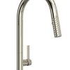 Rohl TE55D1LMSTN Tenerife Polished Chrome C-Spout Pull-Down FaucetThe lush beaches of Tenerife are home to the majestic Canary Island palm, native only to the Islands. This magnificent tree dominates the landscape, with a crown of green leaves that can spread beyond 20 feet. The Tenerife? Kitchen Collection turns the intricate details of this exotic palm into an eye-catching element. The crosshatch embossing on the handles and base replicates the natural diamond-shape pattern of the tree trunk. The faucet column rises in height, mirroring the stature of the tropical palm, accompanied by the long arc of the neck. Tenerife brings a natural island element into kitchens of transitional and modern style. Key Features