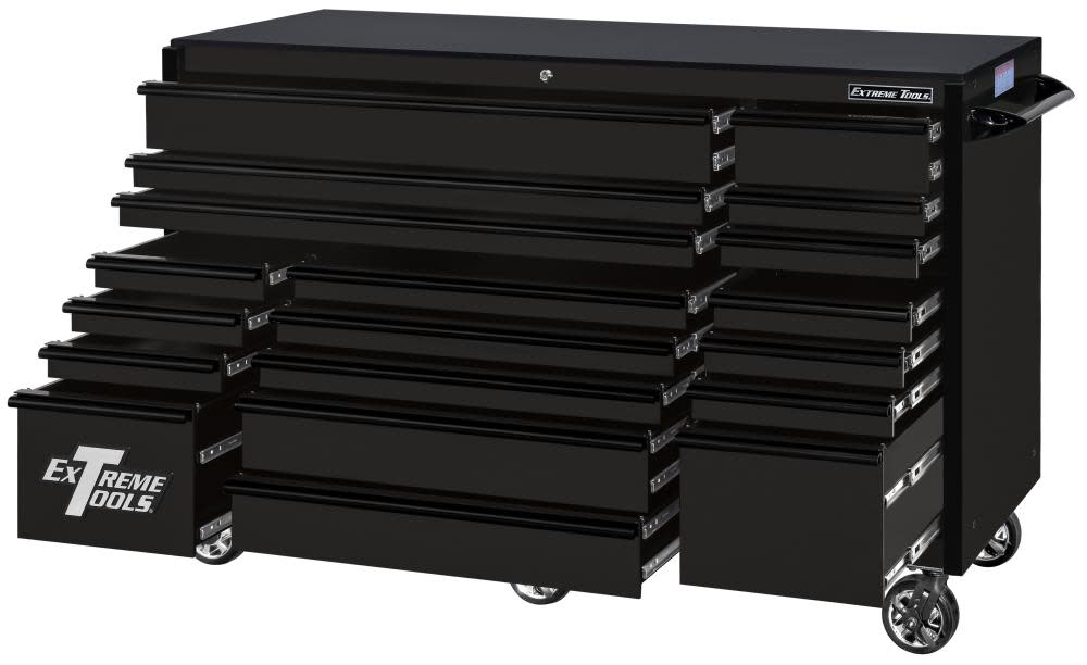 Extreme Tools? RX Series RX723019RC 72 In. 19-Drawer Roller Cabinet is the latest in our RX Series that is 30 In. deep! This professional quality toolbox features 3 extra-long drawers with a support bar to provide strength and prevent warping or twisting. Patented self-latching, Quick Release? drawer pulls attach across the drawer front – not just at the ends – providing a sturdier, more secure handle and keep drawers closed even when moving. Each drawer uses full-extension ball bearing slides that let you load 250-500 Lbs. per drawer (drawers with double slides.) This huge roller cabinet gives you loads of space at an affordable price with the assurance of Extreme Tools? quality.