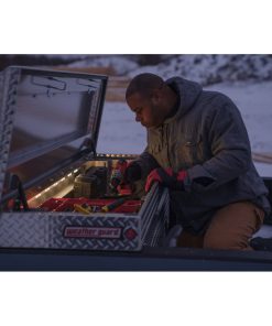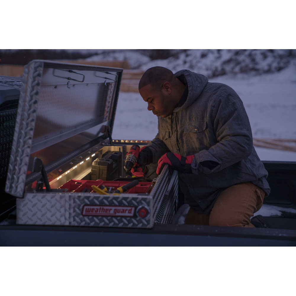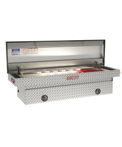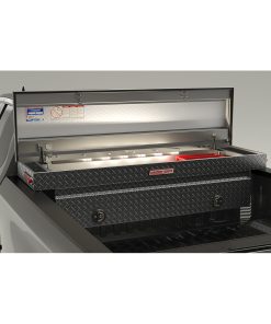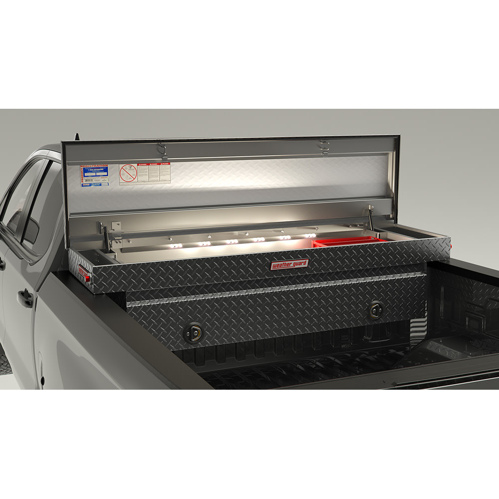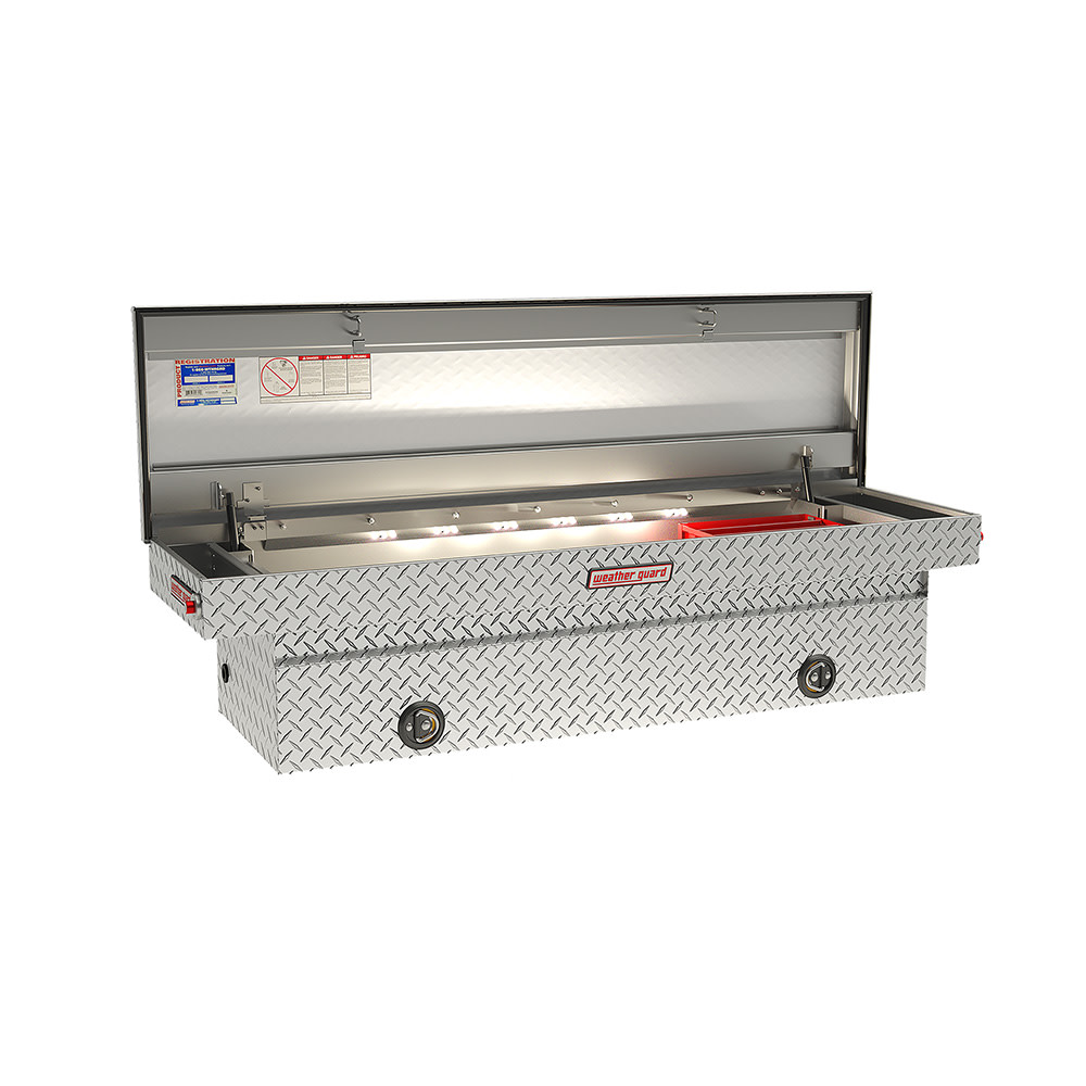 Brilliant, dependable, and durable lighting so you can find what you are looking for anytime of the day or night! The WEATHER GUARD? LIGHTED BOXES feature Patent Pending PowerSync? Lights powered by vehicle power via easy to install wiring harness. Model 127-0-02LF Full-Size Saddle Box features a diamond plate pattern with ARMOR TUF? Clear Coat finish that ensures years of dependability.