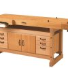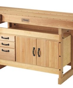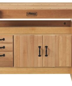 The Sjobergs Scandi Plus workbenches are the perfect bench for the discerning woodworker. The top is made of full length beech laminations without end splices. Top thickness is a full 1-1/2 In. in the center with a 4-5/16 In. skirt for excellent stability. Two rows of bench dog holes extending from each vise for excellent clamping capabilities. Bench dog holes can also be found in the beech trestle. Four 3/4 In. bench dogs with side springs are included. The two vises feature 4.5 In. max capacity. SM03 cabinet is constructed of solid hardwood and hardwood veneers with 3 draws and two doors for great storage capacity. Accessory kit includes ST11 hold down, universal anvil and one set of jaw cushions.