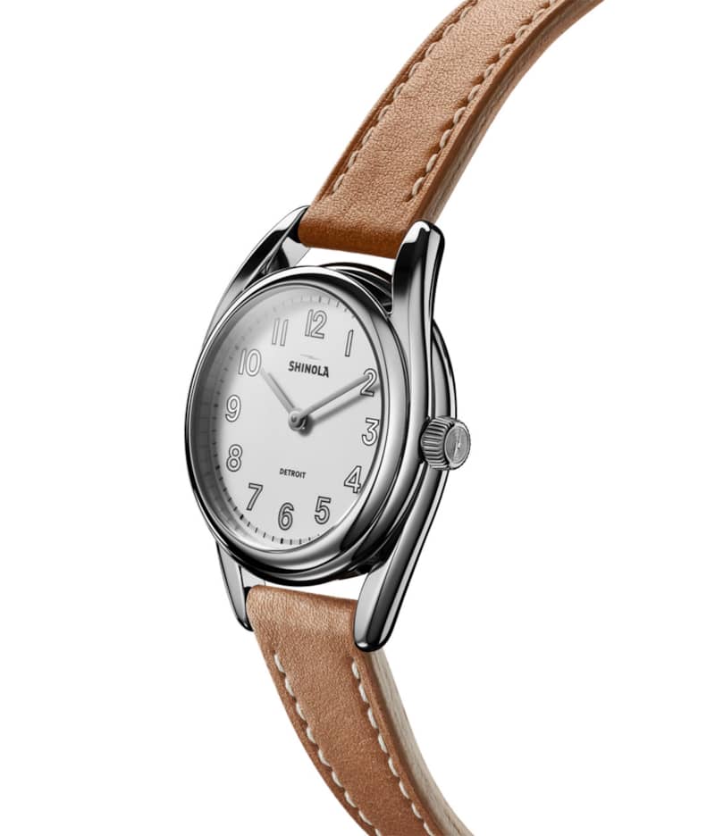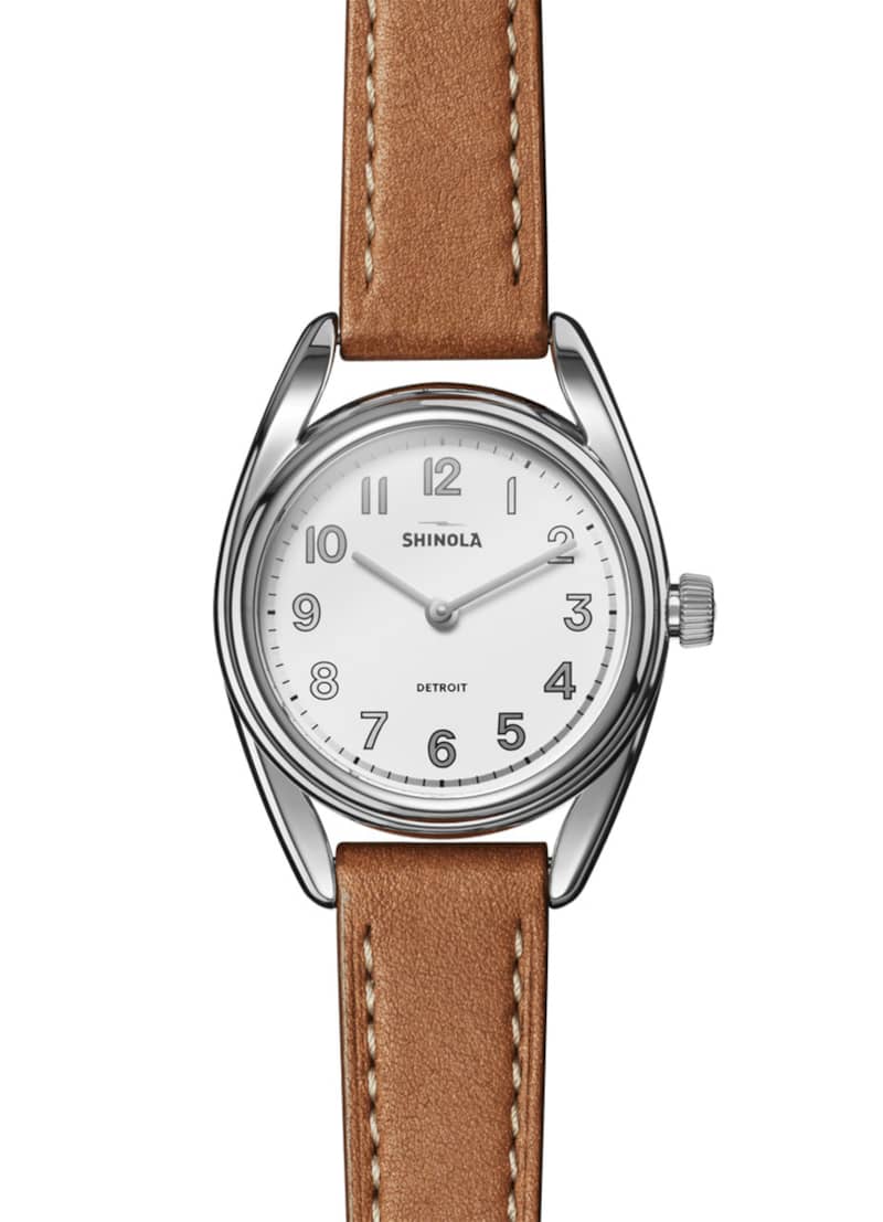 Shinola S0120226428 The Derby White Dial Watch, Cognac Leather Strap, 30mmStyle That Thinks In Decades Front and center: The polished stainless steel case that wraps elegantly around the clean and open dial. Sophisticated and unexpected, it??s a seamless design executed with fresh inspiration from American design heritage. Slim hands and ??knockout?? style numerals on the dial complete the look. Choose either a premium leather strap or a five-link bracelet. Switch up your Derby??s style instantly with the purchase of an additional strap. Our latest watch designed with women in mind is no show pony??it??s built to last, with a design that thinks in decades, not seasons. Features