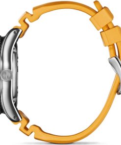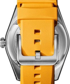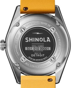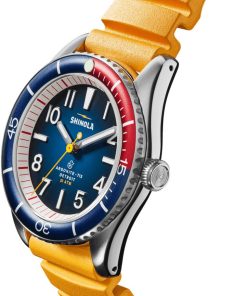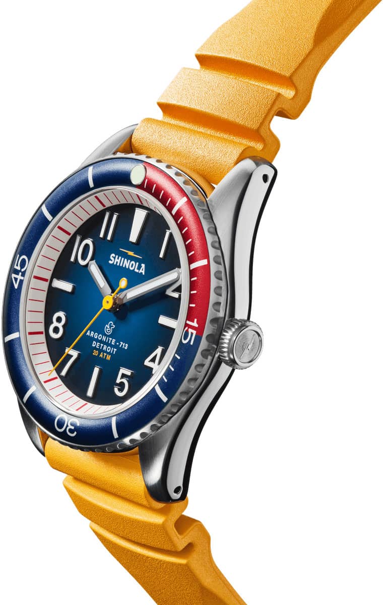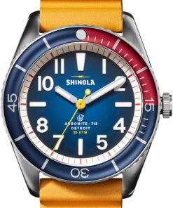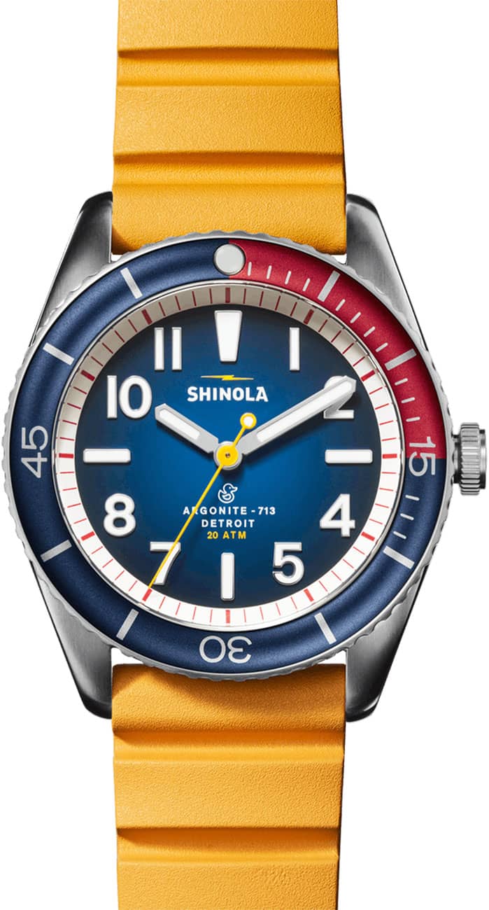 Shinola The Duck Blue Matte Dial w/ Canary Yellow Rubber Strap 42mm Watch, Model S0120242335Surf-rated at 20 ATM, the Duck is a highly capable, adventure-proof, water-resistant surf watch that looks as good out of the water as it does in it. It??s built for whatever life throws at you??whether that??s international pond-hopping or commuting across town. This men??s water-resistant watch features a stainless-steel case with a screw-down crown, unidirectional bezel, extra-thick sapphire crystal, SuperLumi-Nova on the dial and hands, and the same expandable rubber strap as our popular Monster series. Best of all, this surf watch comes in a range of colorways and gift sets??for whatever floats your boat. Whether you’re searching for a functional water-resistant watch or rough and tumble lifestyle watch, get your flippers on the Duck today. Features