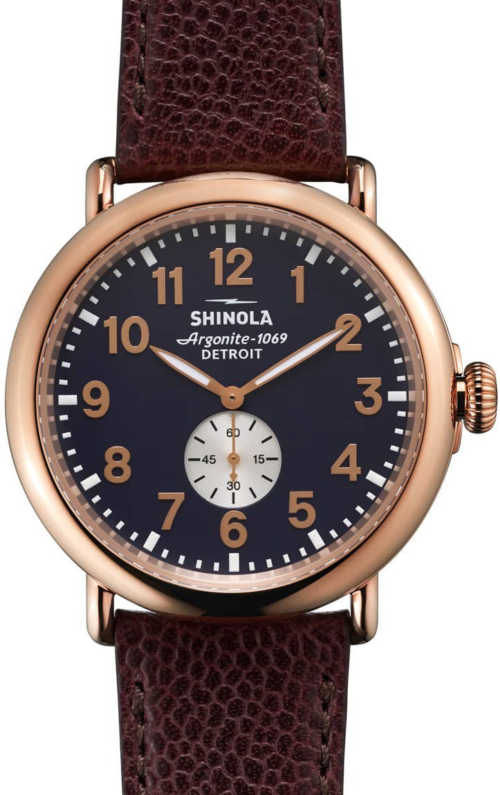 Shinola S0110000168 The Runwell 47mm Watch Midnight Blue w/ Rose Gold Dial & Dark Oxblood Football Leather StrapHand-assembled, The Runwell is a Shinola original. With case plating of polished rose gold setting off a midnight blue dial with silver subeye, the sleek piece is not only made of the highest quality, but looks all the better for it. Add to that a dark oxblood rapid release strap of football leather and the Detroit-built Argonite 1069.2 movement powered by a full 46 Swiss-made components and you??ve got the perfect timepiece to keep you on schedule down to the second, courtesy of it??s miniature subsecond dial inlaid into the face. Features