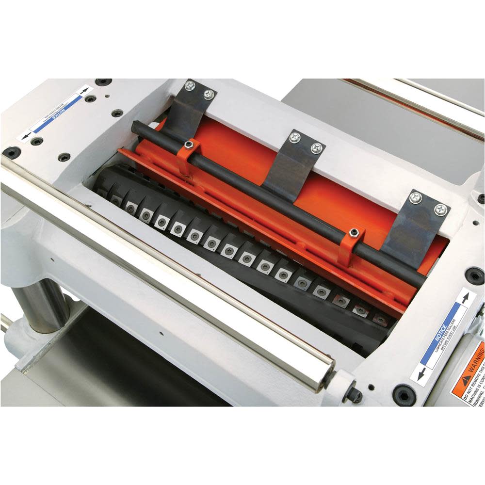 No corners were cut when putting together this feature-rich 15 In. planer. With its 4-flute helical cutterhead, 52 indexable four-sided carbide inserts, and two-speed gearbox, ultra-smooth surfacing is the new normal, even on figured grain. Other features include a pedestal-mounted switch, precision-ground cast-iron infeed and outfeed tables, and large board return rollers for efficient production. CSA certified. Helical cutterhead with triple V-belt drive. 2-speed chain-driven automatic feed rollers. Hardened anti-kickback fingers. Precision-ground cast-iron table and extension wings. Locking table. Magnetic switch overload protection. Ball bearing return rollers. Depth scales in both inch and metric. Pedestal-mounted control panel. Infeed rollers: solid serrated steel. Outfeed rollers: knurled steel.