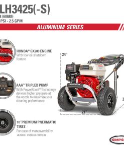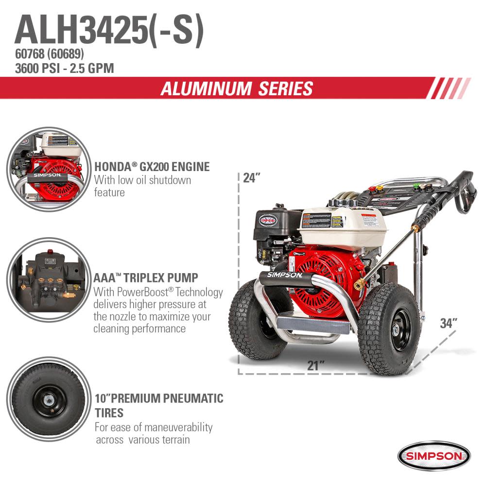 Simpson Gas Pressure Washer Aluminum 3600 PSI at 2.5 GPM HONDA GX200 with AAA Triplex Plunger Pump Cold Water Professional