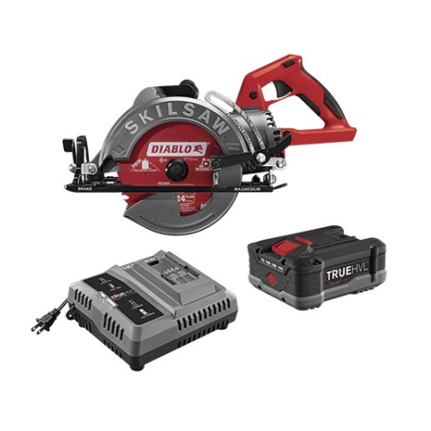 The first and only cordless worm drive saw gives you legendary SKILSAW power to go anywhere. Powered by the TRUEHVL™ battery, designed specifically for our legendary worm drive saw. The brushless motor responds to challenging applications by boosting power and torque and all magnesium construction makes it lightweight and tough. TRUEHVL™ features a unique battery design that maximizes heat dissipation, patented Stay Cool™ technology that wraps each cell in a temperature controlling material and intelligent power management that monitors and optimizes each cell. Together, these innovations deliver the ultimate in performance and an entire day of work on a fully charged battery. Go from zero to full charge in only one hr. Get all the power you need, from the only cordless worm drive saw. SKILSAW has redefined power. Again.