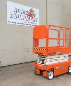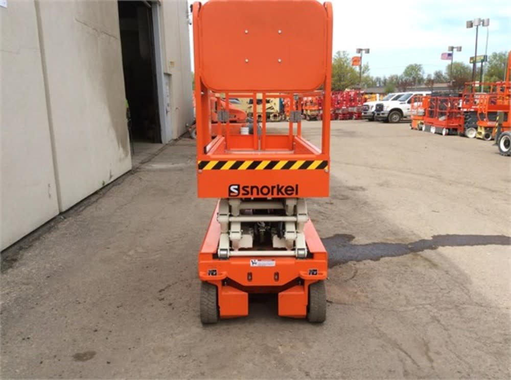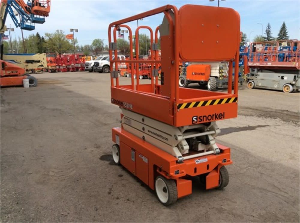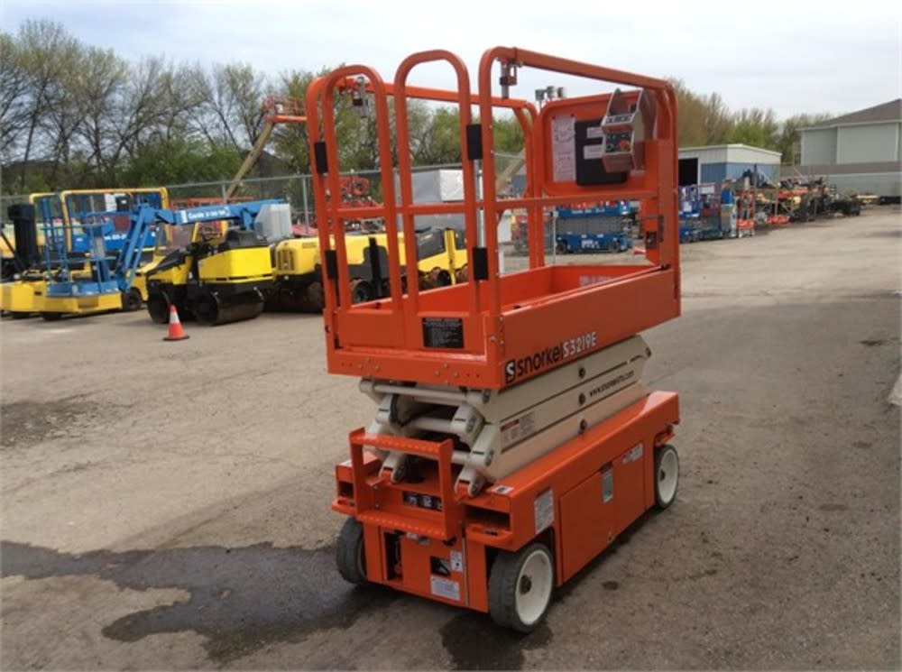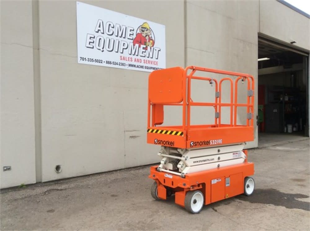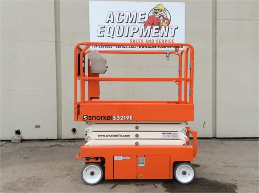 STK# S3219E New SNORKEL S3219E 19′ Electric Scissor Lift, ANSI Compliant, Wired Remote Control, No-Mar Tires. Hour meter current at time of listing. Hours are subject to change. The Snorkel S3219E electric scissor lift packs big features in a compact size. Easily driven through a standard doorway, this scissor lift suits indoor and outdoor applications. A telescopic roll-out deck extension maximizes platform space and deep cycle batteries maximize working hours. Features Roll-out deck extension with dual locks Non-marking tires Swing-out service trays Saloon-door style entry gates Descent alarm All motion alarm Key switch 2 persons indoors 1 person outdoors Proportional controls, including descent Power line to platform Loading pendant Hour meter & on-board diagnostics display Integrated battery charger Battery condition indicator Crane & forklift points Dual lanyard attachment points Scissor stack roller slide plates (set of 2) 2 year parts & labor, 5 year structural warranty Specifications Model S3219E Power Source Battery Max. Platform Height 19′ Max. Platform Capacity 550 lb. Platform Size Stowed 28.25″ X63.75″ Platform Size Extended 28.25″ X99.75″ Deck Extension 36″ Overall Length 70.4″ Overall Width 32″ Stowed Height 83″ Max. Wind Speed 28 mph Max. Drive Speed Elevated 0.4 mph Max. Drive Speed Stowed 2.0 mph Machine Weight 2,900 lb. Acme Equipment is here to provide you all of the information you need to make an educated purchase, as well as support you after the sale with parts, service, and warranty. Let us help you make a great investment. *** We Ship To All 50 States. We Have a Loading Dock, Forklift and Loading Personnel ***
