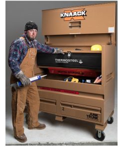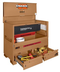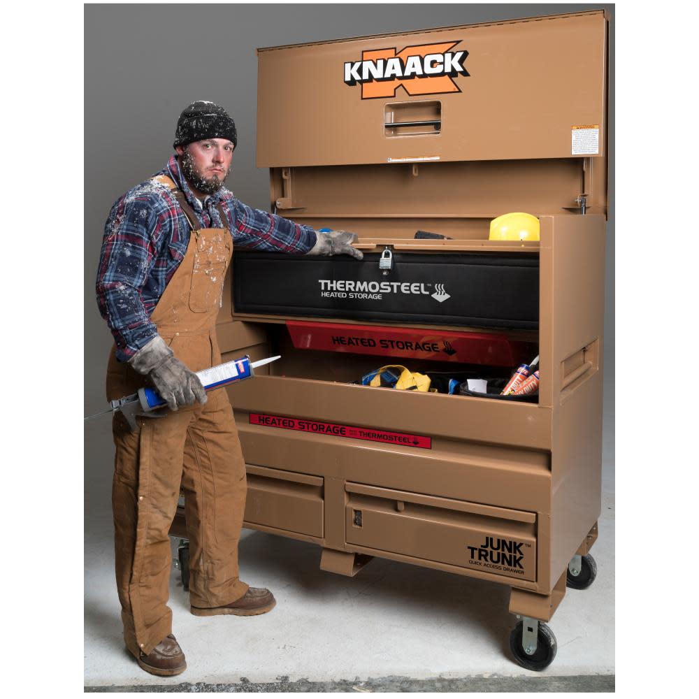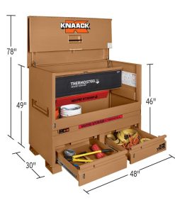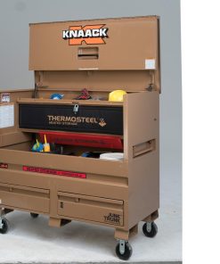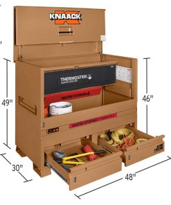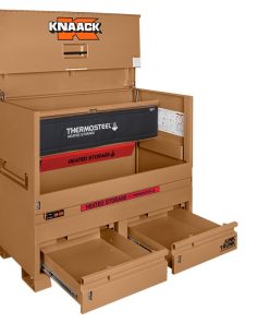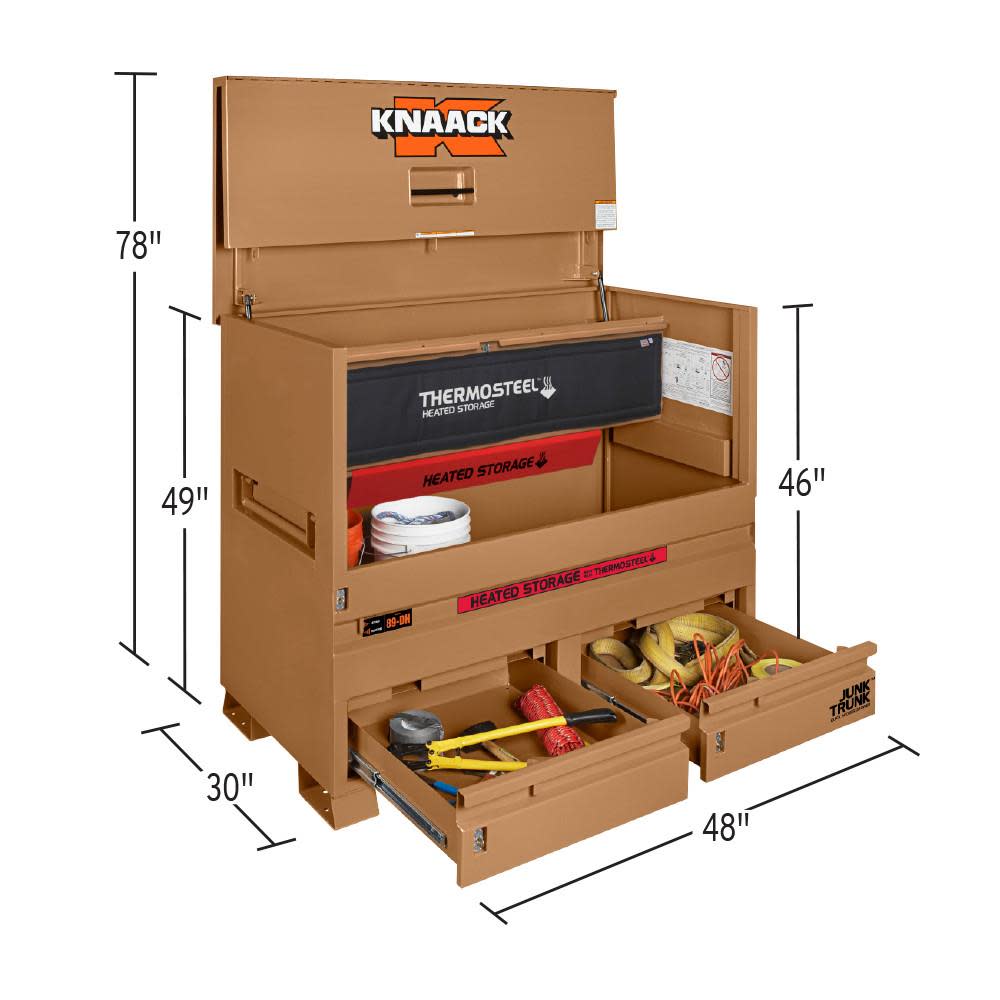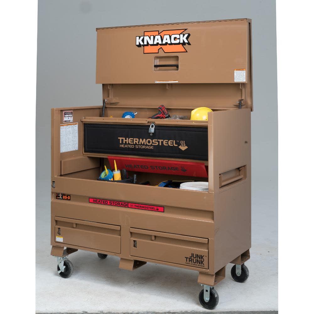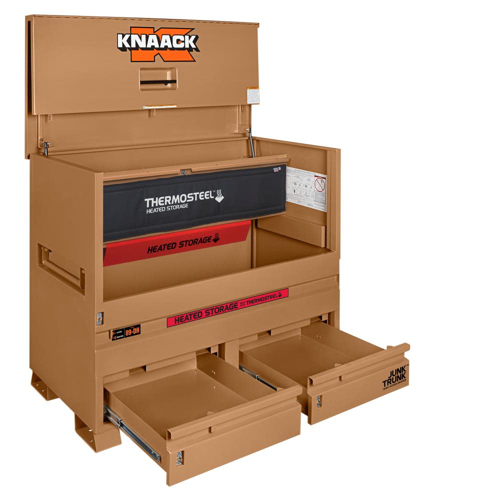 The model 89-DH STORAGEMASTER? piano box with JUNK TRUNK? and thermosteel? measures 48 In. wide, 49 In. tall and has a capacity of 36.2 Cu. Ft. ideal for every trade, it is caster-ready and includes full-width shelves for organization of tools and supplies. Featuring an independent locking drawer for quick access to high-demand tools and accessories, and heated storage to keep everything at the optimal temperature. It also features a bi-fold cover which folds completely out of the way for unrestricted access and fits perfectly in the width of a full-size truck bed.