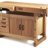 Fine furniture makers, carpenters, and serious woodworkers will appreciate how easily they can do a wide variety of projects on the Original 1900 Workbench. Its long, solid 71-inch (1805 mm) work top will support projects of any size, and bench dog holes on the top and legs will give you plenty of angles to complete detailed work. The bench dog holes are 3/4 in. so you can use standard size accessories. The bench has a 35.4-in. (900 mm) working height. The shoulder vise, a traditional take on the standard tail vise, doesn’t have any hardware to get in the way when working on longer pieces, and it won’t rack when clamping off-center. The bench is manufactured from European beech wood in Sweden.