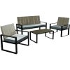 Carlton 5-piece patio dining set. 42-inch square dining table features a durable steel frame covered with PE wicker trim and includes a tempered glass top. 4 outdoor dining chairs feature a durable steel frame covered with PE wicker. Chairs are stackable.