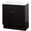 Fully assembled and include a cultured marble top with integrated bowl and backsplash for a seamless, one-piece design. Fully constructed of engineered wood. The doors are finished with a moisture and fade resistant coating. Completed with brushed nickel hardware and durable euro style hinges. Faucet sold separately.